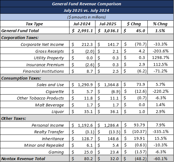 Overall, monthly tax revenue for the General Fund was 3.2% higher than last year. Corporate net income tax (CNIT) revenues for the month totaled $141.7 million, or $70.7 million less than July of 2024. Sales and use tax (SUT) revenues were $1.36 billion, or $73.9 million higher year-over-year. Similarly, personal income tax (PIT) brought in $1.28 billion for July of 2025, or $93.7 million above last year.