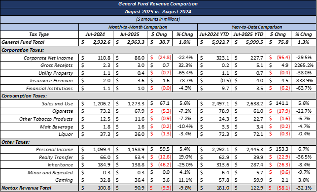 Overall, monthly tax revenue for the General Fund was 1.4% higher than last year. Corporate net income tax (CNIT) revenues for the month totaled $86 million, or $24.8 million less than August of 2024. Sales and use tax (SUT) revenues were $1.27 billion, or $67.1 million higher year-over-year. Similarly, personal income tax (PIT) brought in $1.15 billion for August of 2025, or $59.5 million above last year.