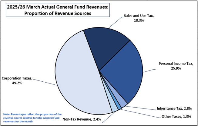 General Fund revenue continues to remain ahead of projections. Fiscal year-to-date, General Fund revenues were $34.9 billion, $473.8 million (1.4%) above estimate. March’s General Fund collections were $6.5 billion, $91.9 million (1.4%) above estimate, driven primarily by overperformance in Corporate (Gross Receipts and Financial Institutions) and Consumption (Sales and Use) tax receipts.